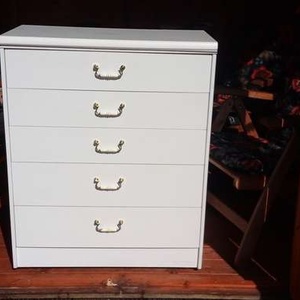 5 drawer white bedroom unit; Dimensions: (all sizes approximate) Height 37 1/4" 994.5cm) - Width 30" (76.5cm) - Depth 16" (40.5cm) To be collected