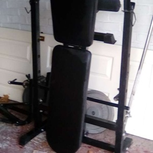 Bench press and weights believed to be Marcy.