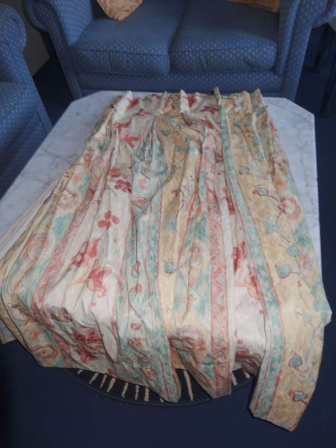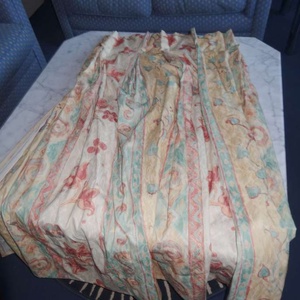 We have a pair of bespoke mae to measure curtains to give away from a smoke and pet free home, so no funny odours. Pinch pleated with a button at the top of the pleat and are lined too. They were made to fit an 88inch wide window and have a drop of 51inches. There is quite a big hem, which I have taken down on one of them, as I was thinking of using them in our new home