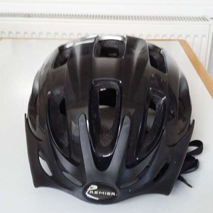 A good as new Premier adult bike helmet. black and grey. Ventilation gaps. Adjustable chin strap.