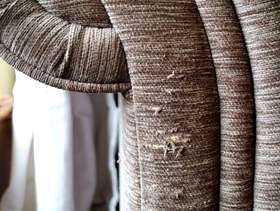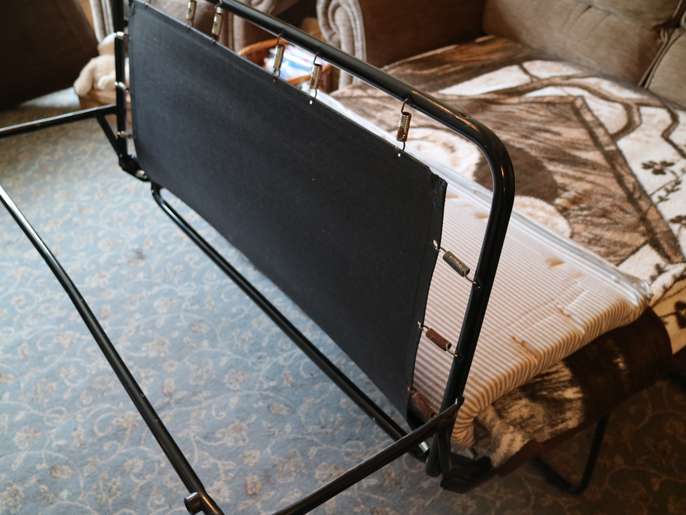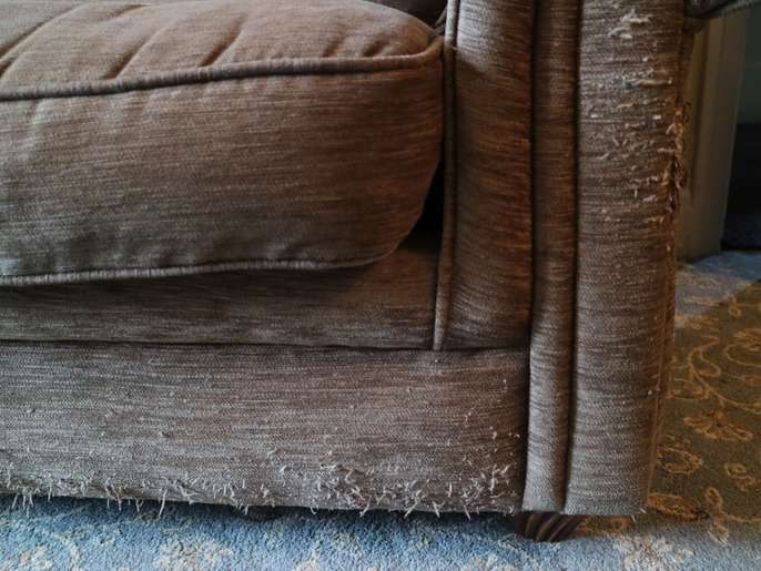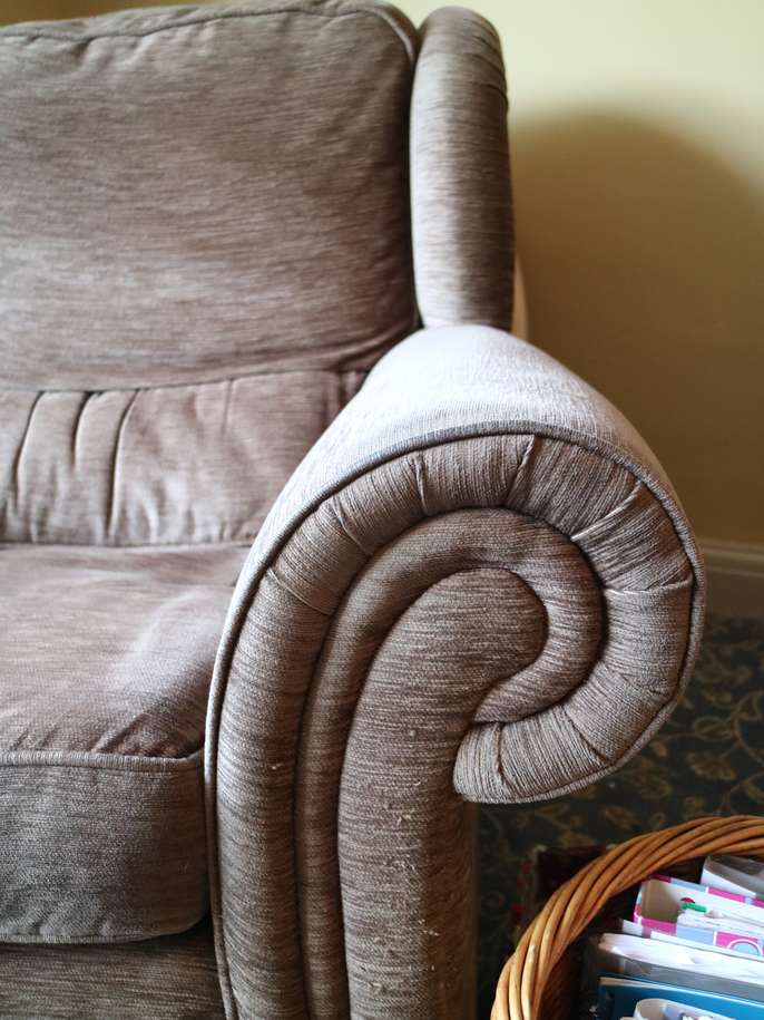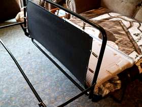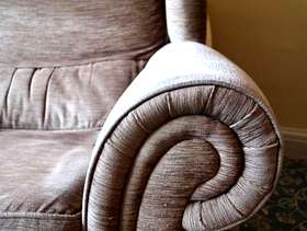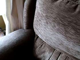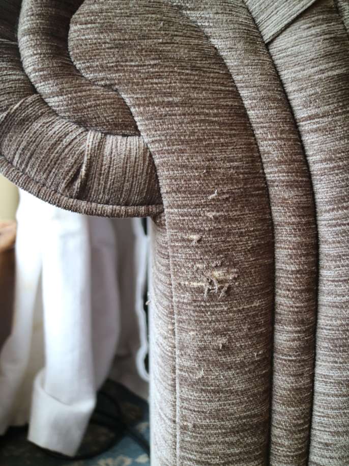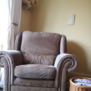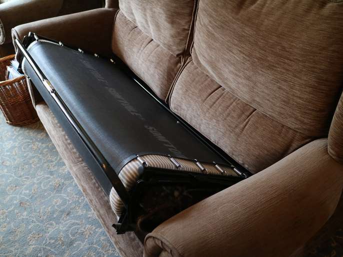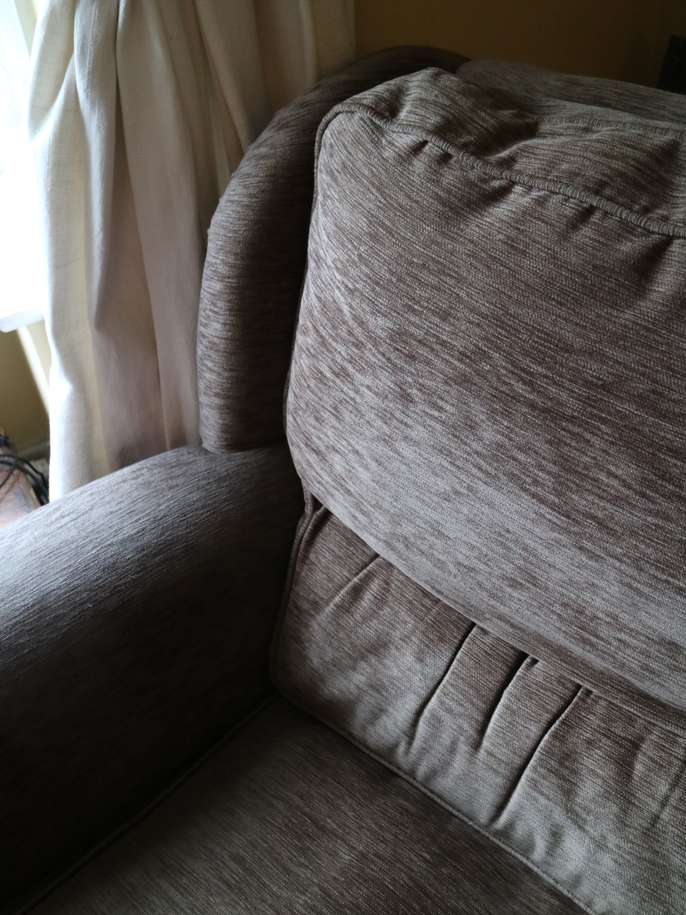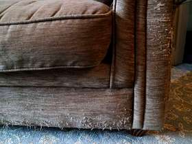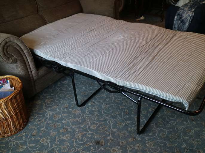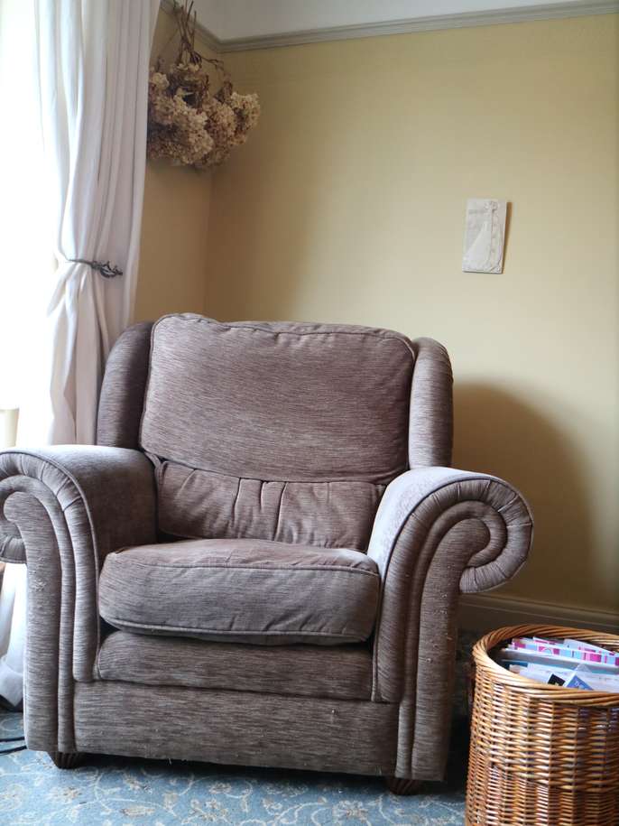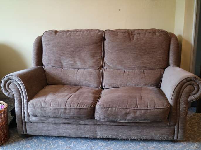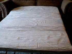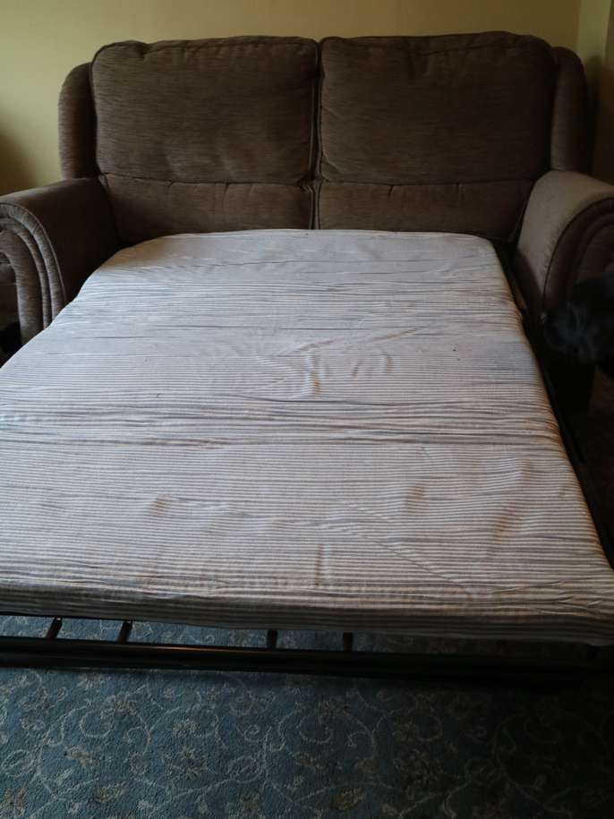 Bed Settee Sofa and Chair - soft honey brown warm feel fabric 1 mile from city, Gloucester, Gloucestershire BED SETTEE large 2 cushion sofa 185cm extends to full size double bed on black steel frame, sprung base with mattress included. Metal frame spring loaded so opens easily. Cushion covers zip off for washing. Mattress is clean. ARMCHAIR large, matching. 118 wide. Removable cushion covers. BOTH ITEMS high backed at 100 cm, about 100cm deep, Scroll fronts. 5 years old. Heavy. Some cat scratches to side panels but no rips at all (see photos) otherwise all good. Needs to go by December 4th.