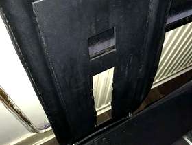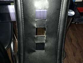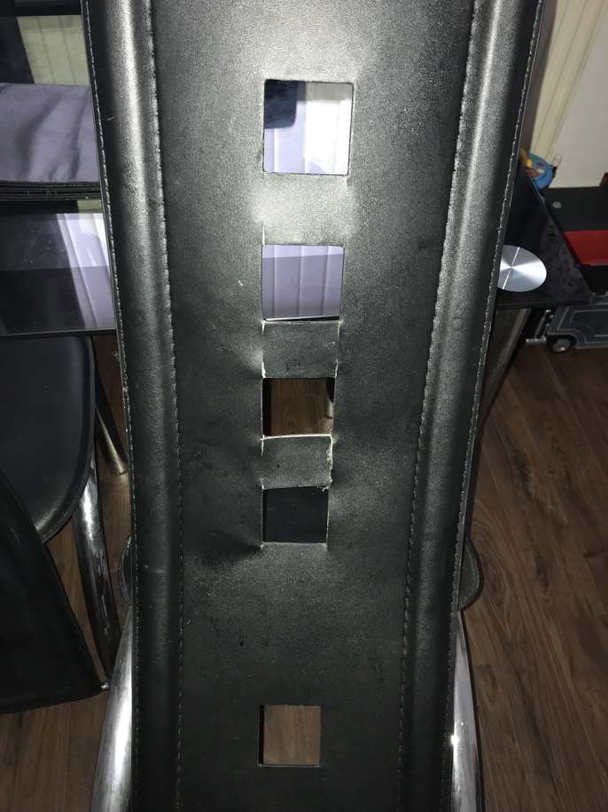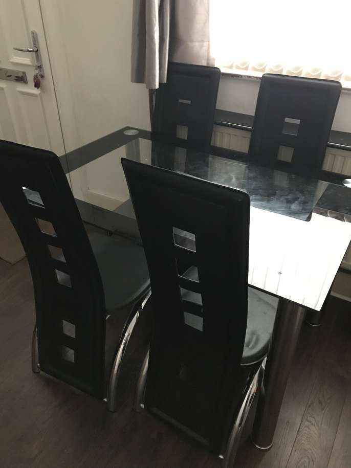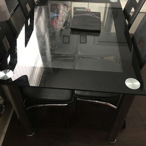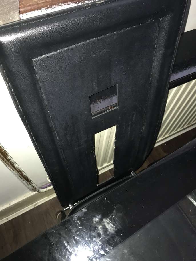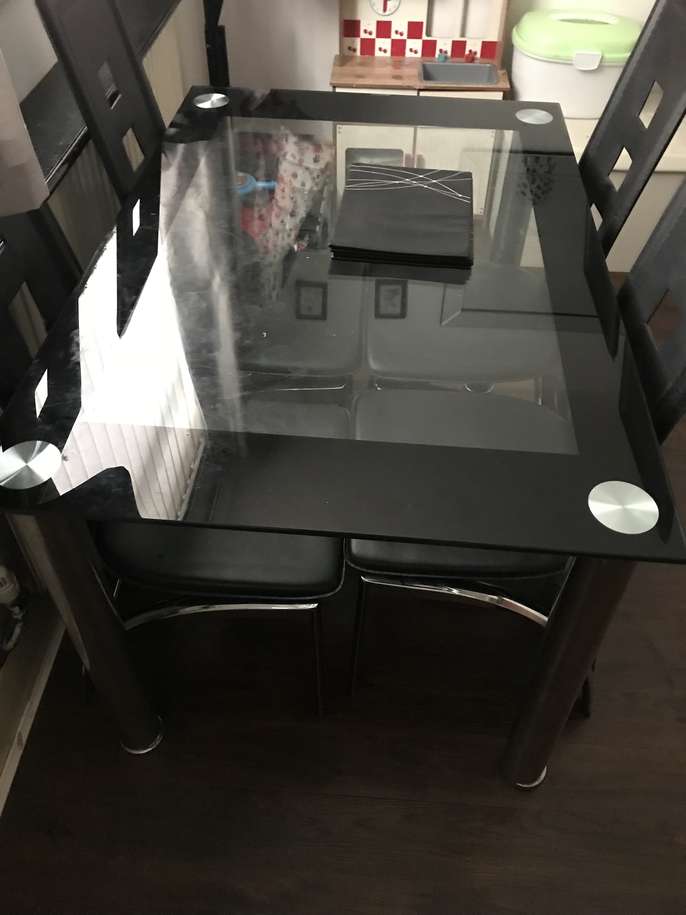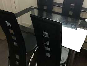 Black n clear glass table with four leatherette chairs two slightly damaged... see pics. In good used condition. Must be collected from Chatham n must all go together...