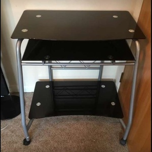 Black glass desk with pull out surface for keyboard etc. Top surface is 70cm W x 40cm D Total dimensions are approx. 54cm D x 74cm W x 78cm H Collection only, Shoreham Beach.