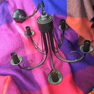 Black metal chandelier. 5 arms each with bayonet fitting for candle bulb.