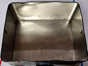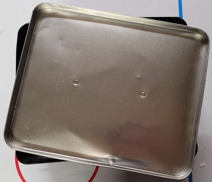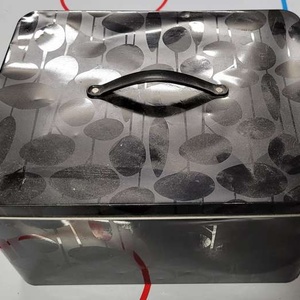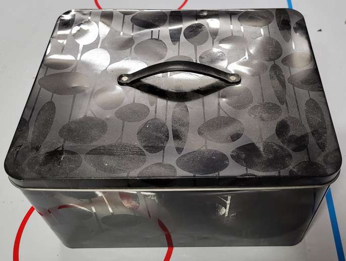 I'm offering a black metal lidded storage tin with a carry handle. The tin and the lid have a few dents but still go together fine. The tin is approximately 28cm x 23cm x 15cm, including the lid and handle. It's been stored under a bed for a while, so could do with a clean-off but is generally solid. Collection will be from Finchampstead.