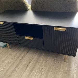Black TV stand, minimal use, L 120cm, W 40cm, D58cm.