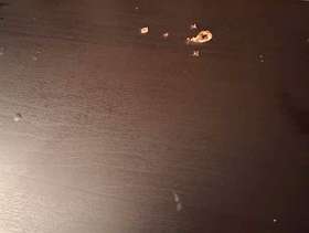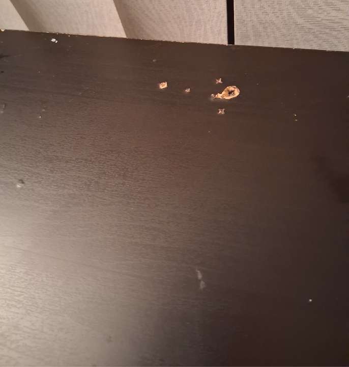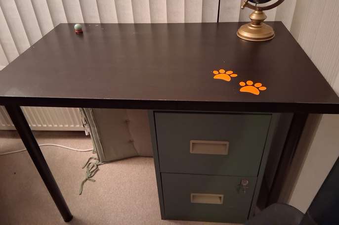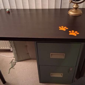 Black wooden table/desk with removeable metal legs Orange paw print stickers have been attached and slight damage(as shown) on top. 23" wide, 39" long x 29" high (approximately) Filing cabinet not included Collect from Cheddleton