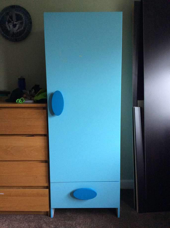 Blue IKEA wardrobe with drawer (bought 2006) Also includes darker blue decorative trim around door top & sides, additional shelving & fixings. Ht 170cm x W 59cm x D 41cm.