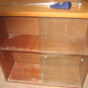 Light oak type of book case. 3 ft x 3 ft With glass and two shelves. I promise to clean it before you collect. It is covered in dust!!!