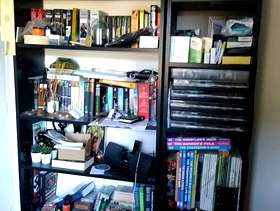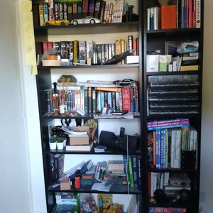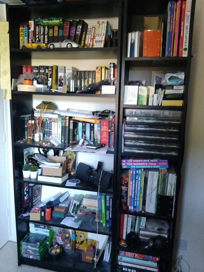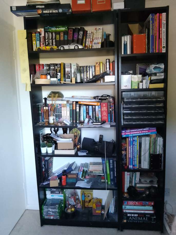 2 black Ikea bookcase/DVD shelves. Stand separately 1. 28cm deep x 40cm wide x 200 high 2. 28cm deep x 80 wide x 200 high