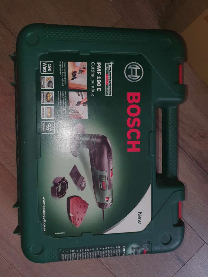 Bosch PMF 190 E cutting and sanding tool. 190watt. Oscillating system, depth stop, pre-selection tool. Handy and versatile all rounder for precise working on floors, walls and in tight corners on wood, Non-ferrous metal, plaster, plastic, tiles and more. Plus additional sanding pads for all sanding needs.