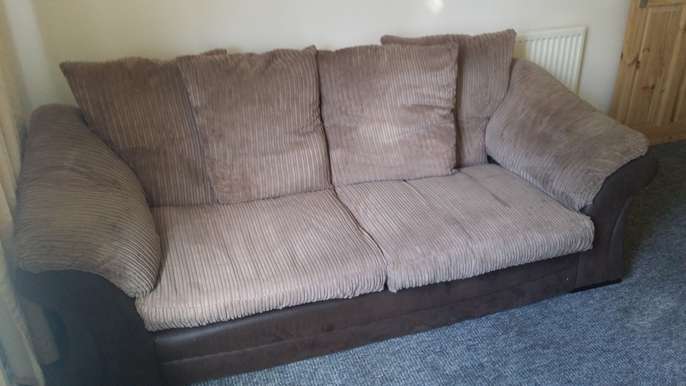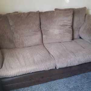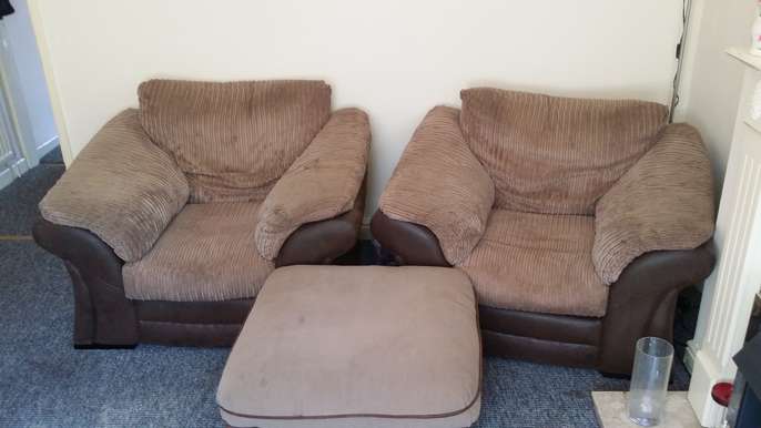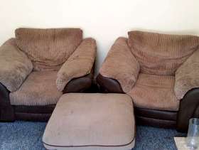 Brown 3 seatter settee and 2 chairs with foot stool, needs a little clean. Would suit someone moving into an empty flat/house, collection only.
