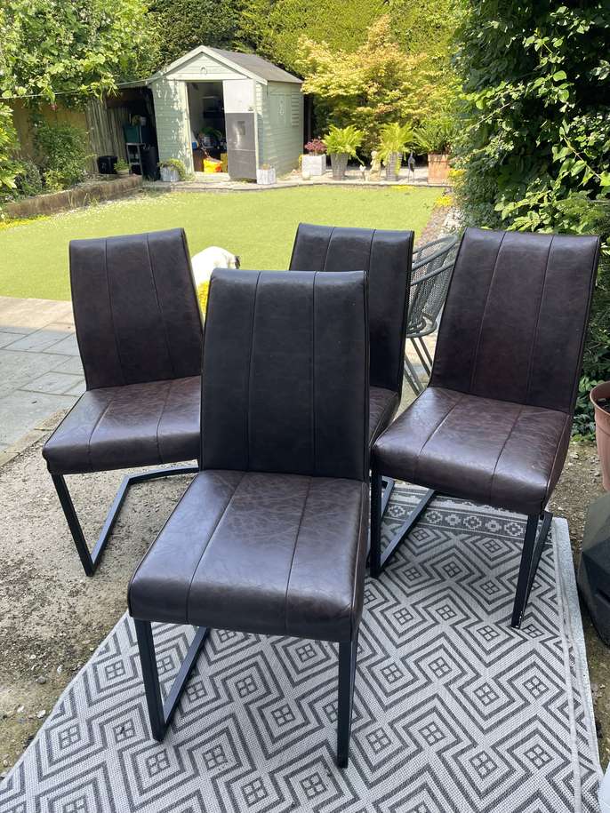 4 x used but in good condition brown faux leather and black metal base dining chairs. Very comfortable. Hardly used.