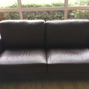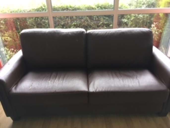 Dark Brown Faux Leather Three seater sofa (approx. 180cm wide), has been very well used and but fabric cracked on the seat pads. Small tear on the side. Frame appears to be fine as it is still very comfortable. Collection from Longfield by 4th November . 01474 705237