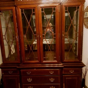 Reasonable condition with a few knocks. Glass top with mirrored back and internal lights. Bottom section has 2 cupboards and 4 drawers. Needs to be collected.