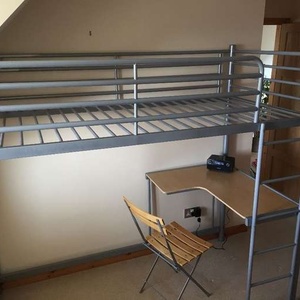 Silver metal cabin bed, good condition. There are various stickers that our son has put on it that you may want to take off. Easy to assemble. The bed is regular dimensions.