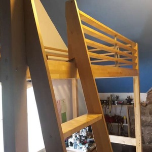 Hardwood ikea high bed and mattress. Comes with ladder. Total height 210cm, Bed base 172cm high - length 210 width104. . Can be dismantled to fit on top of a car.