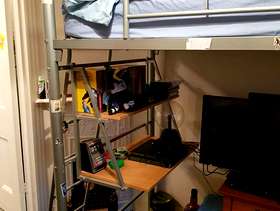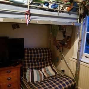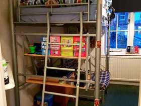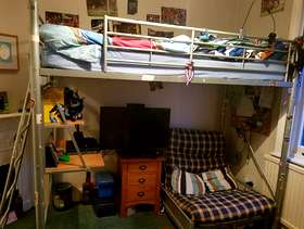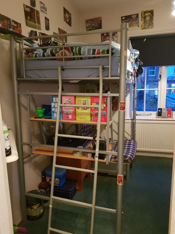 Metal cabin bed - mattress wont be included. With a single futon sofa/sofa bed under and a desk and shelves. Includes futon mattress. Needs someone to come and dismantle it and bring tools to do so!