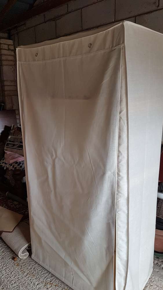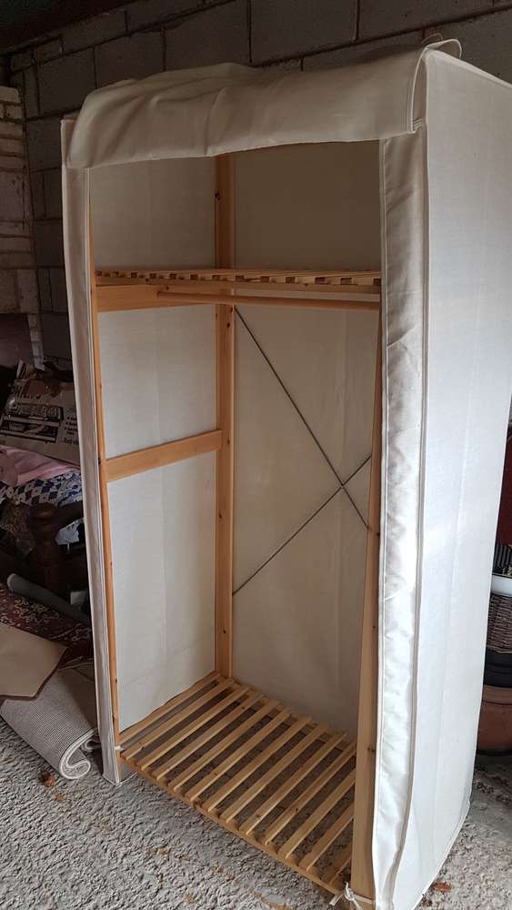 Wooden frame wardrobe with one shelf and a hanging rail. Has a canvas cover. Collection only please, from Goosnargh.