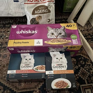 Our cat died recently and we have some unopened boxes of cat food pouches and a bag of dried food for older cats which are available for collection.