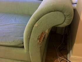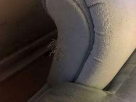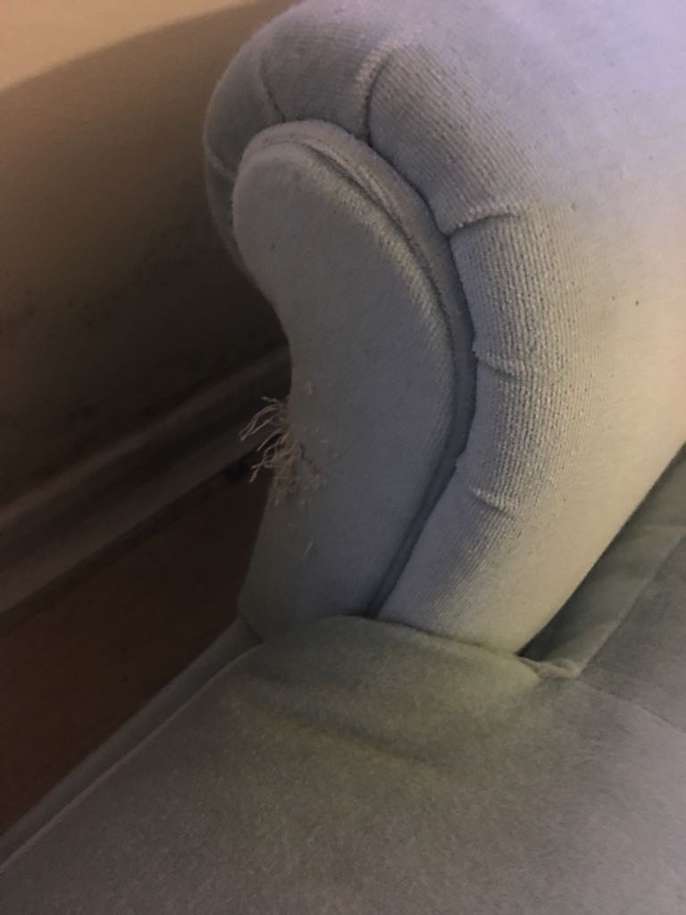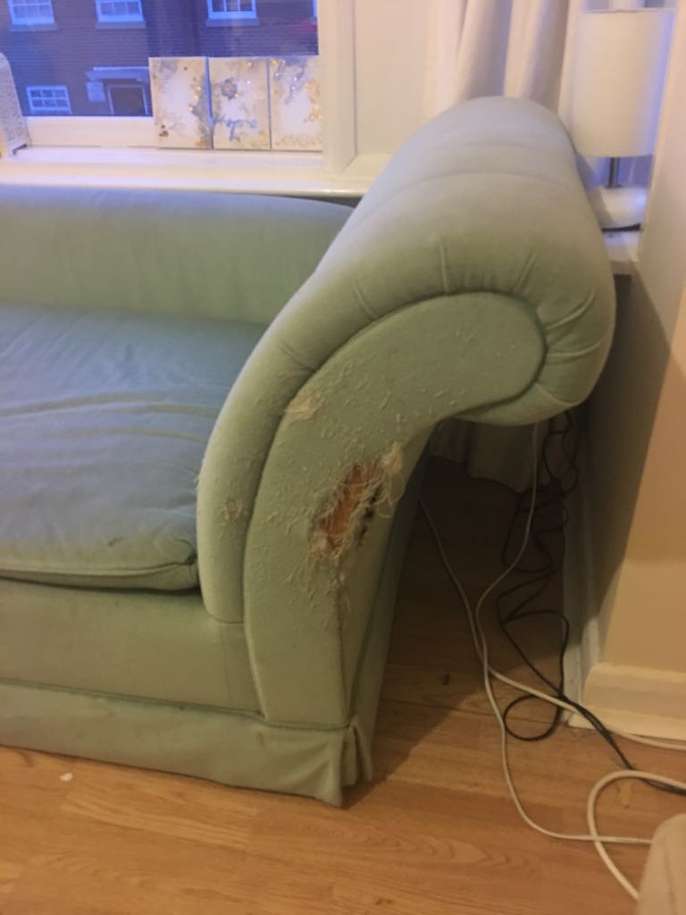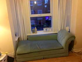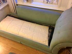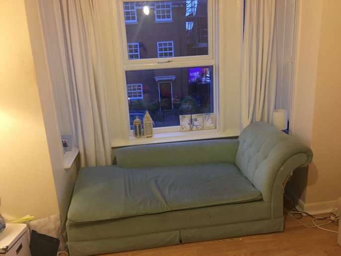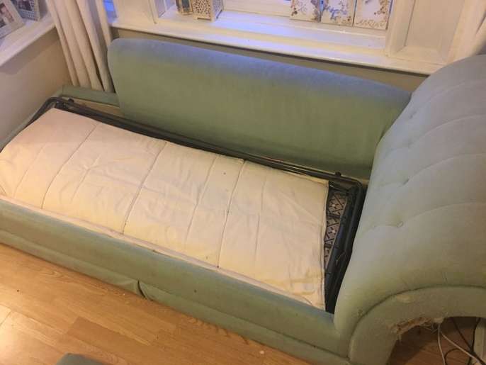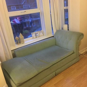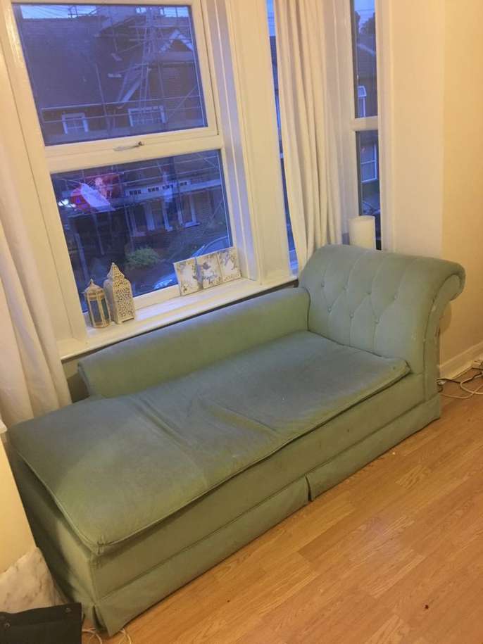Chaise long that also has a bed that folds out one leg (on the bed part) is slightly bent but is easily fixable for anyone who is DIY savvy (think screw needs loosening then replacing the position and retightening again). One end is slightly scratched due to previous owners cat. It is heavy and is collection only
