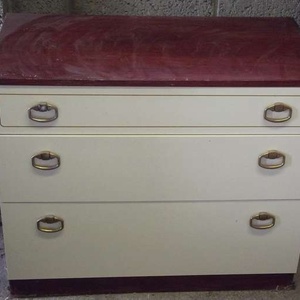 Three drawer chest. Cream front, woodgrain sides and top. Gilt handles. Drawers run smoothly. Top probably needs re-varnished.