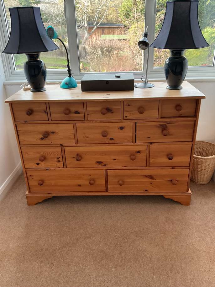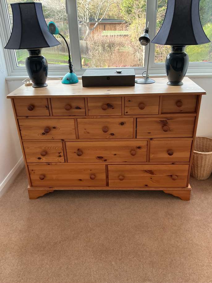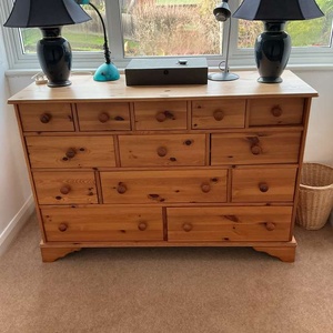 Chest of drawers This item is in Loughton GB All the details Wooden chest of drawers. It is 4’2” wide, 2’10” high and 1’7” deep. Category Furniture Request This Item Ask a Question Post Message