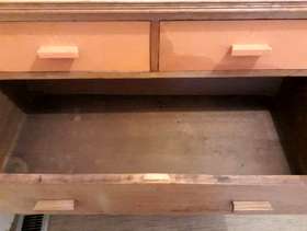 Chest of drawers. Made of wood. It consists of 3 long drawers and 2 small drawers. I started to upcycle it (but I don't have time to finish it), so the 2 small drawers and 1 of the long drawers is painted orange but only 1 coat, so can be easily painted over. Dimensions are: Width 102 cm x Depth 48cm x Height 99cm. Collection only.