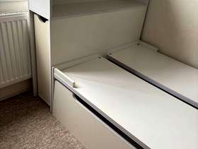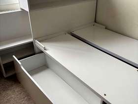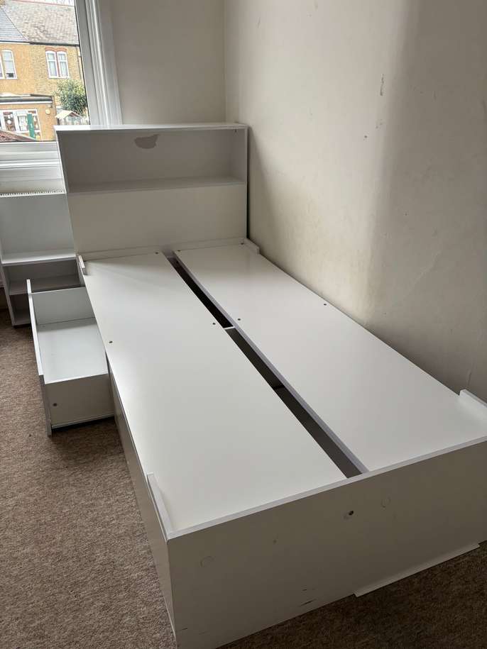 Under bed storage, bookshelf and integrated bookcase. Suitable for child up to 7yrs old. Will dissemble for collection. You will need to download assembly instructions from the internet. A few dents and marks, and bodge job repairs but it’s alright for a free item!!