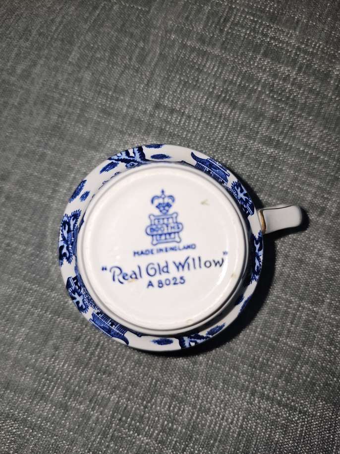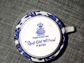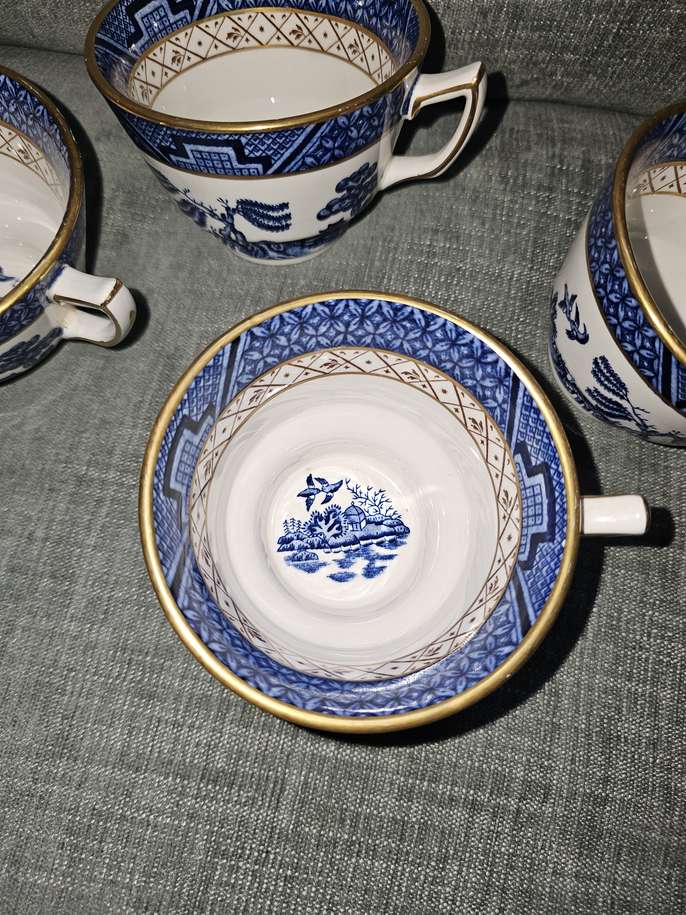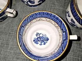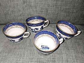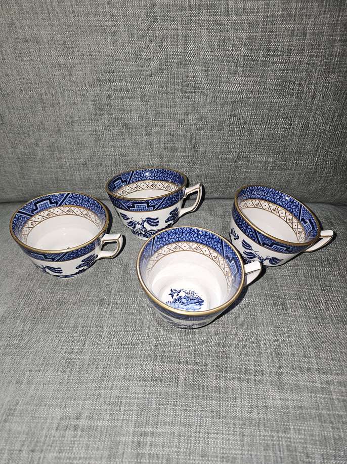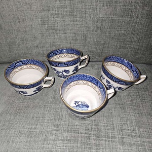 4 x China "real old willow" tea cups 7cm high x 10.5cm wide inc handle No chips, good condition
