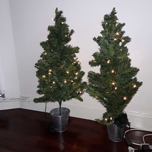 Lighted Christmas trees,1 metre high, suitable for inside or porch. Need plugging in inside and pots need weighting down. Buyer collects.