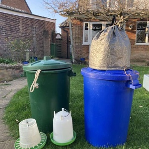2 x feed bins Feeder Waterer plus homemade frost cover Hanging rope treat holder