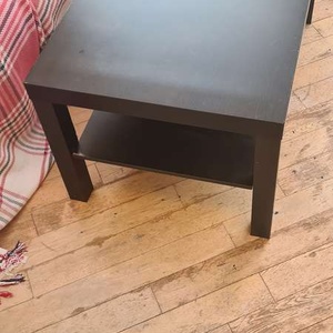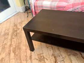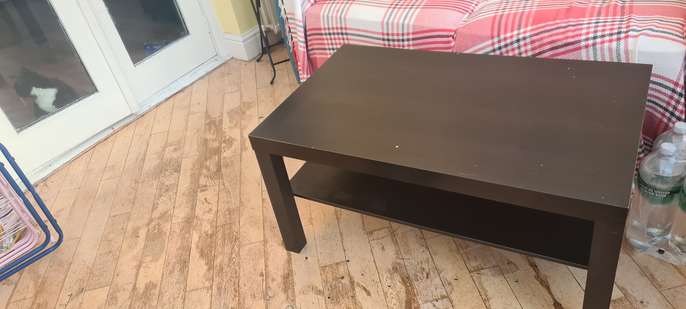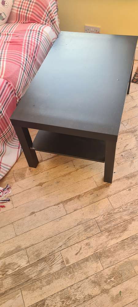 Large functional coffee table with lower level rack. Some marks and black Laminate coming off in one place but otherwise sturdy