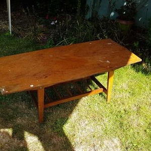 Coffee table. Retro shape to it. The joins have a screw here or there. Paint splatters too. I think this would make a great upcycling project. I was going to paint it but just haven't the time. Approx measurements: 110cm by 46cm. height 39cm