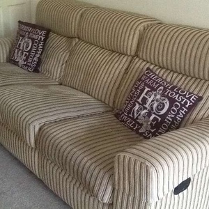 Three-seater settee covered in a stripe fabric. The colour of the fabric is pale green, brown and ivory on a taupe background. Well looked after in very good condition.