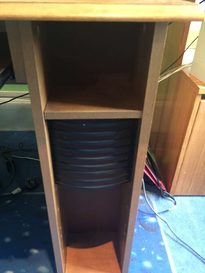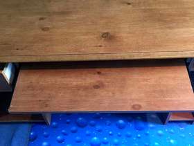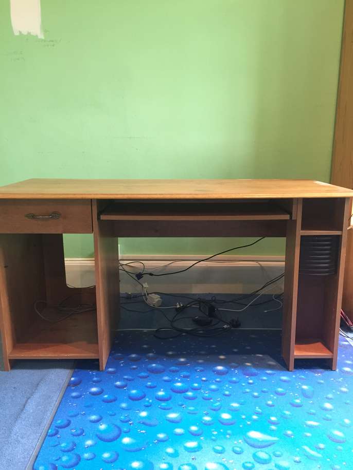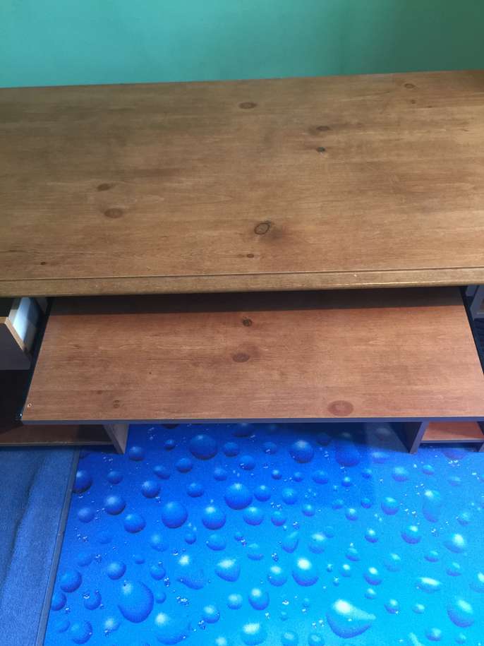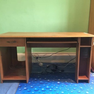 A wood laminate computer desk with space for a computer tower on one side, and CDs or DVDs on other. It has one draw. Under the top there is a pull out shelf for the keyboard. It is a medium brown colour. Darker than pine, lighter than mahogany. In pretty good condition, has been used by one child. Some faint scratches on top but honestly not many. Depth 60cm, width 136cm, height 72cm.