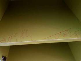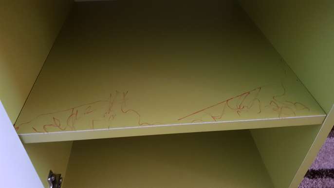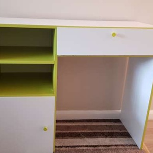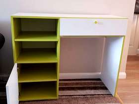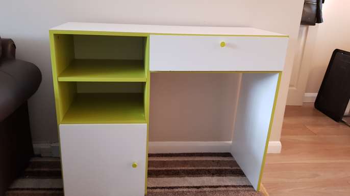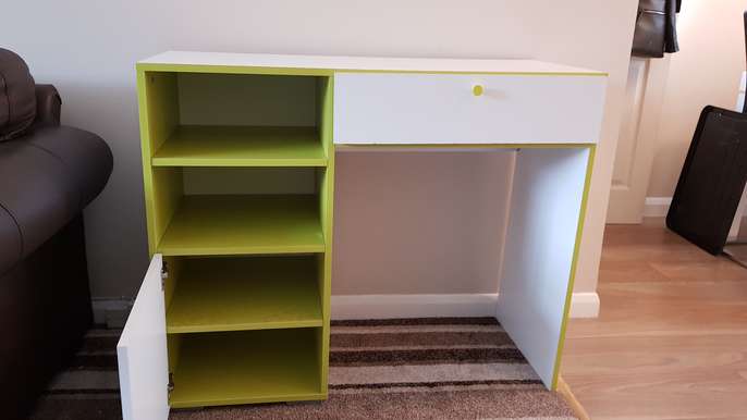 Very well used computer desk. Scribbles of crayon on one of the shelves (See photos) Height 82cm Width 100cm Depth 41cm.