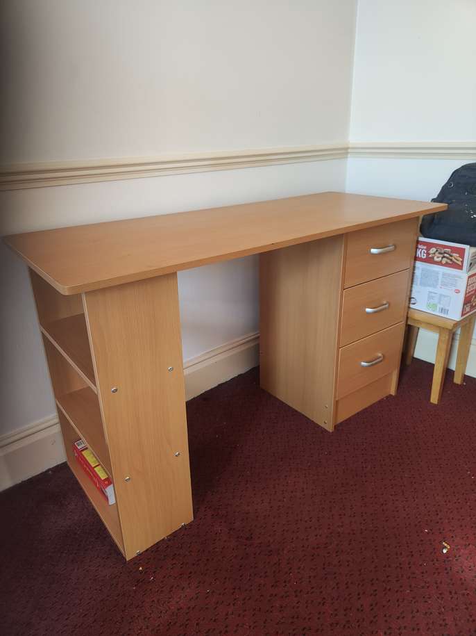 Computer desk free to good home. It has 3 drawers, and 3 side shelves. In excellent condition.