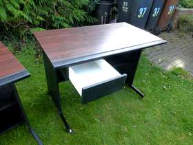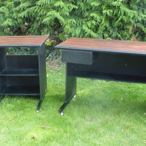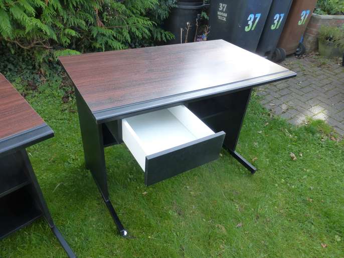 Black computer desk and matching printer table with cherry laminate finish on top. Pencil groove along length of both. Very smart and sturdy. Has been moved from downstairs to upstairs and from room to room - you would hardly know at all. Couple of very small blemishes in hard to see places. Drawer can be fitted to either left or right hand side. Printer table top has open slot at the back for wiring. Both have a half high, half deep shelf at back. On castors for easy movement. Desk: 100 cm wide, 59 cm deep, 72 cm high; Printer table: top 59 cm square, 72 cm high.