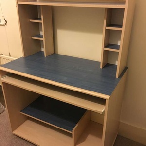 Wooden computer table in Beech & Blue. Good condition. Various shelves & storage sections, and a pull out tray. Separates into two parts for transportation. For collection on Friday or Saturday.