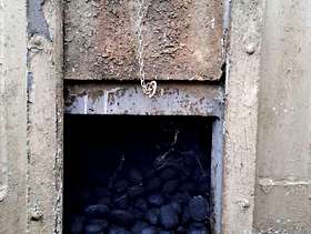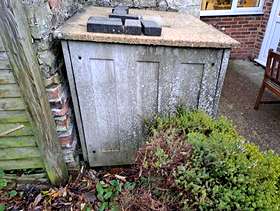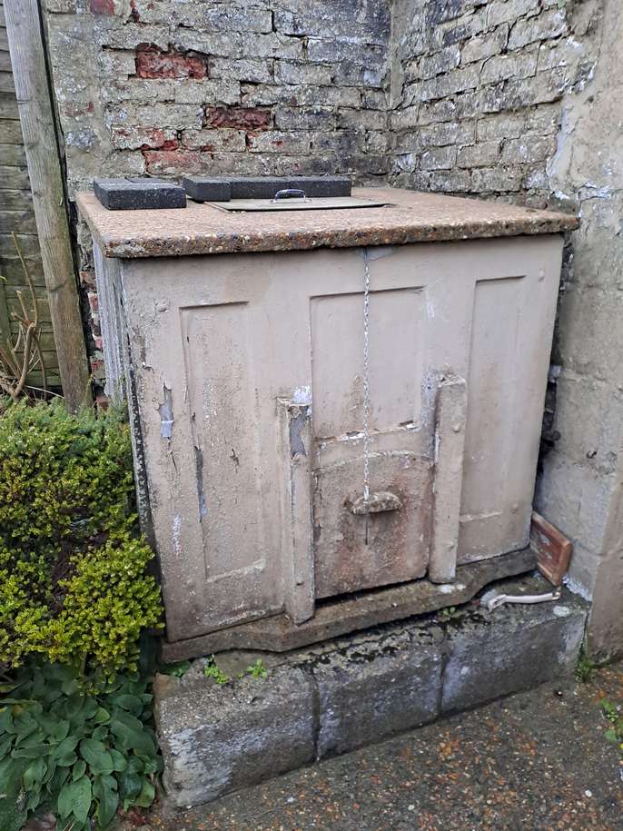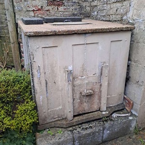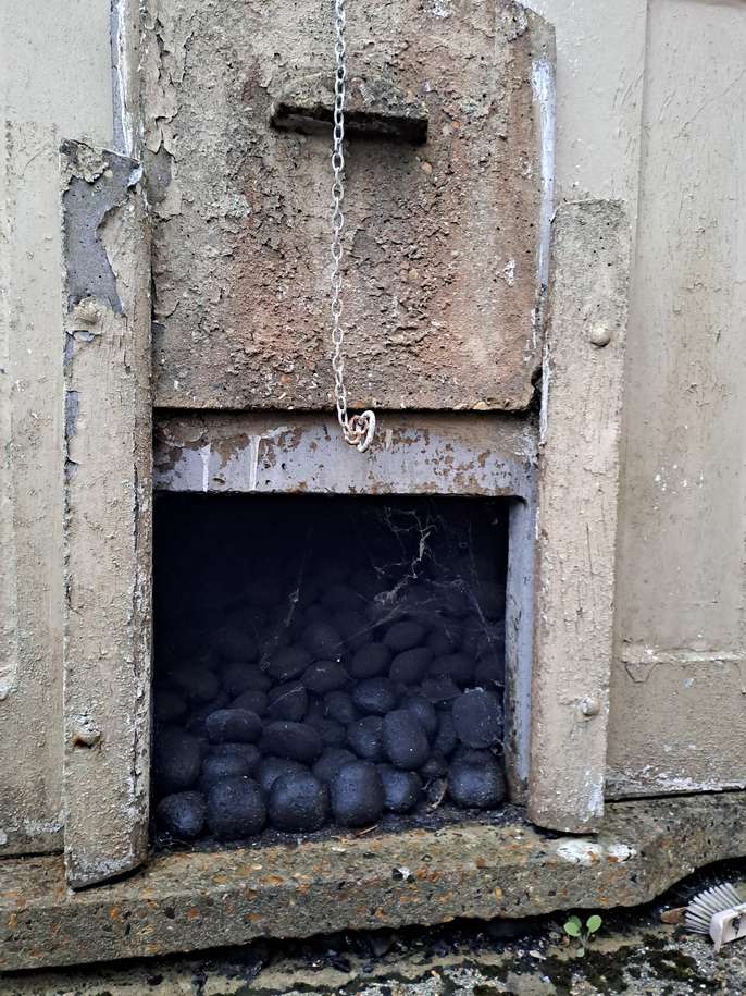 Concrete coal bunker free to a good home including 2 sacks of coal nuggets suitable for an indoor fire. Very heavy! Will need to be dismantled by the collector. It appears to have bolts holding the sides together so should come apart into 4 side panels, base and top. Height approx 102cm at front, 106cm at back Width approx 112cm Depth approx 106cm