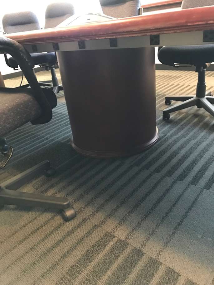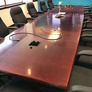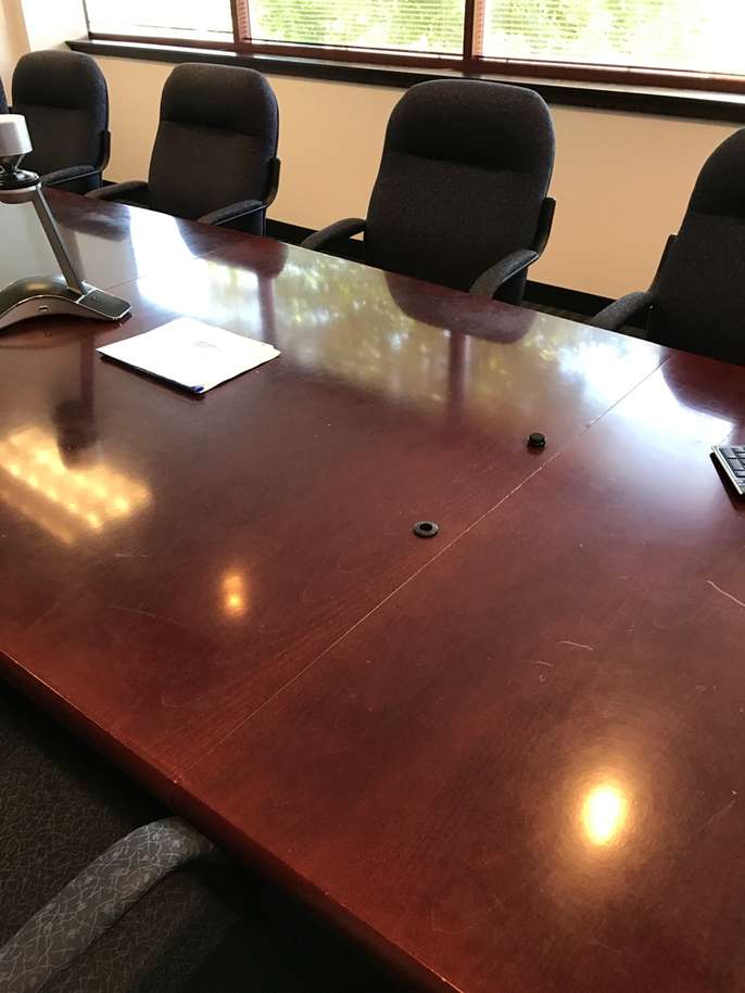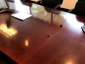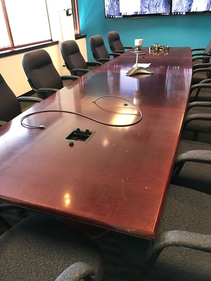 Dark Wood conference table - measures 16'x4.5' - comes apart in seven sections (four table top and three large round legs (see photo). Available for pickup Monday July 10th during the day - time flexible. Great for a church or a school or an office. Very sturdy, great life left in it.