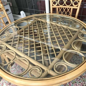 Bamboo and glass topped table with 4 chairs. Chairs covered in small floral print. Very good condition
