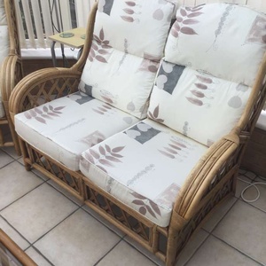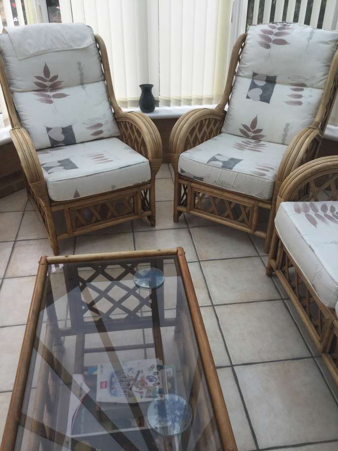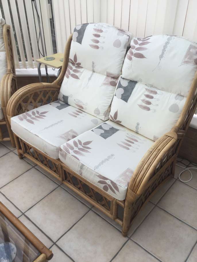Two seater sofa, 2 chairs and coffee table. Cushions have faded over the years and one worn