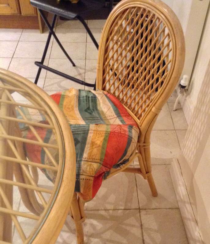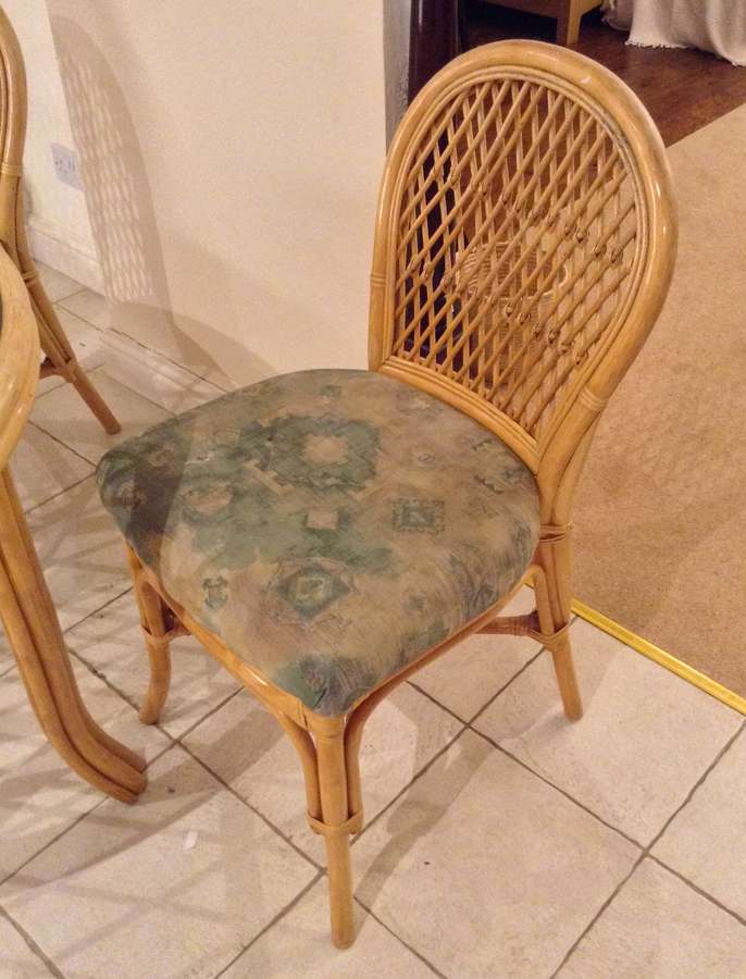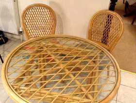 This is a solid cane round glass top table, the glass top is removable for cleaning, it is solid and heavy! So would need two to lift off. Am letting this go with two chairs, both would look fab if cleverly recovered. The table measures two feet 6 inches high and Three feet two inches across. Since we moved here a year ago this table has been in my kitchen, but this is not an ideal place for it. For collection please.