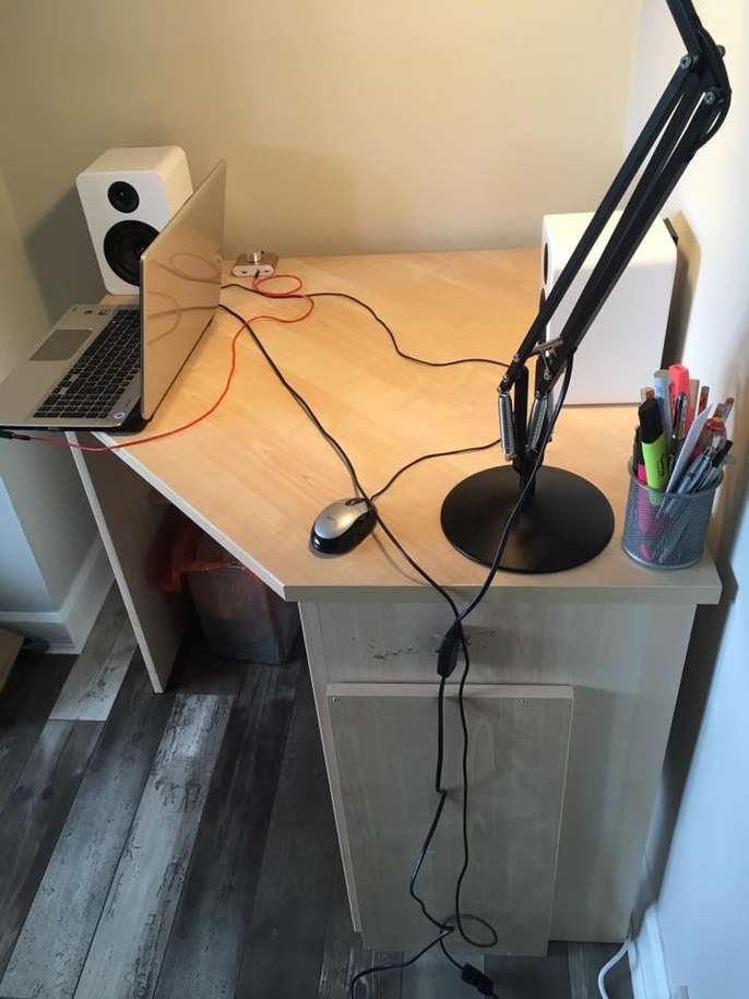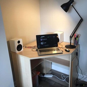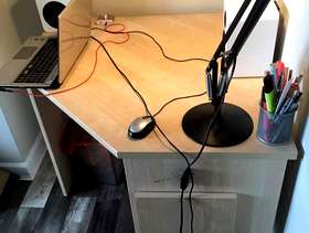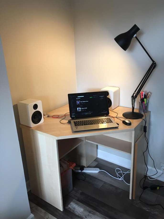 Good quality corner desk. 90 x 90 cm across the top, 75cm high. Some light signs of wear, and some sticker tape marks that'll come off easily.