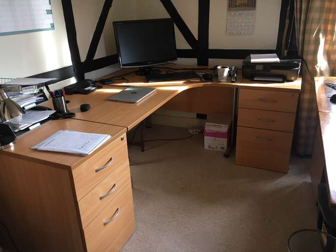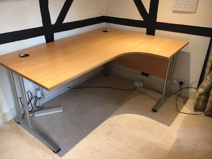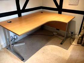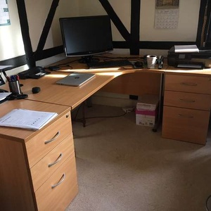 Corner desk with 2 matching pedestals. Beech colour. Some of the fixings for one of the privacy panels got damaged in a move but otherwise in very good condition. Dimensions: 1600mm x 1200mm wide x 720mm high. Buyer to collect please.