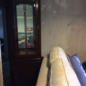 Cupboard with shelf below. Mirrored display, with light, glass shelves with grooves for display plates, etched glass in door. Keys top and bottom. Unit comes apart for easy handling.