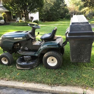 Belt broken. Some oil leakage. But otherwise operable. Have three bin grass catcher. Left at the front of the house at 659 Westwind Dr, Berwyn, PA