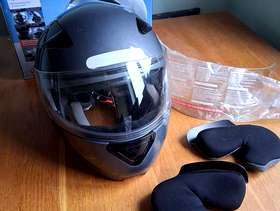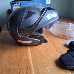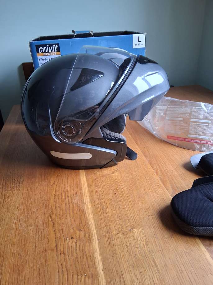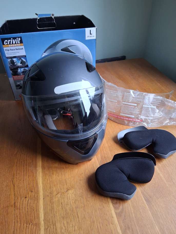 Flip front crash helmet with spare unused visor and spare unused cheek pads. In good condition, but manufactured in 2009.